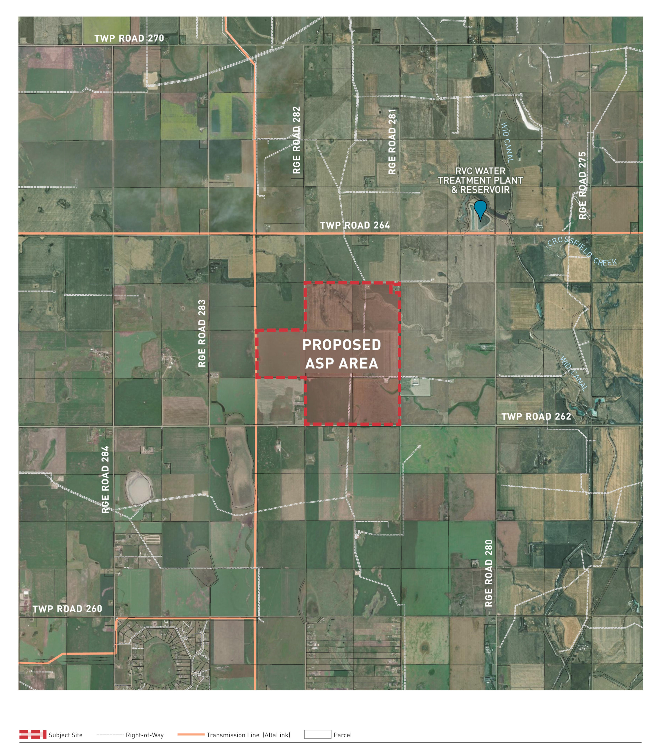 The proposed ASP covers approximately 1,120 acres of land located directly north of Highway 566 and west of Range Road 281. These lands are ideally located in Rocky View County, with direct access to Highway 566 and adjacent to 240 kV electrical transmission lines—making the site well-suited for large-scale technology infrastructure.